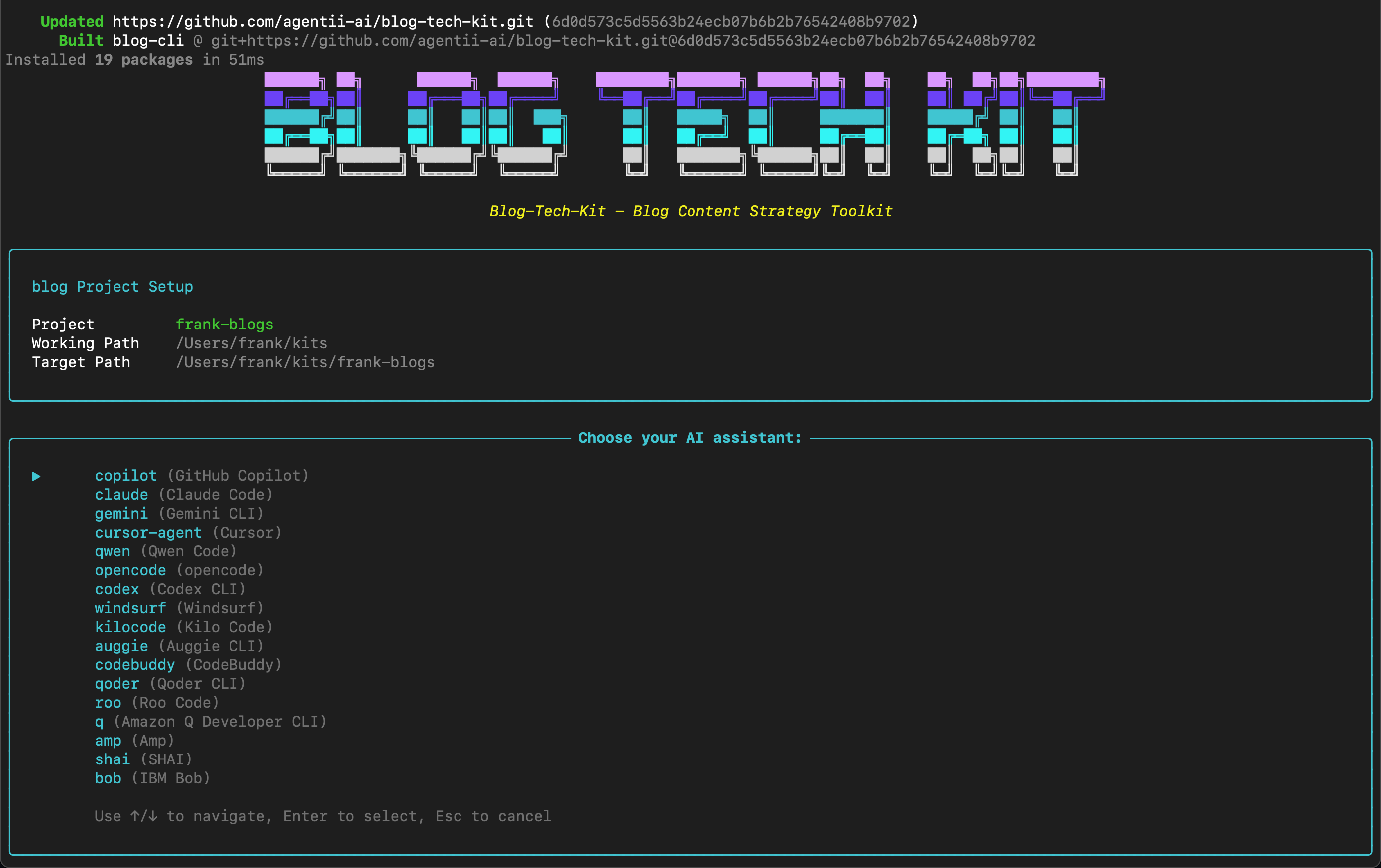 uv tool install blog-cli --from git+https://github.com/agentii-ai/blog-tech-kit.git然后直接使用该工具: