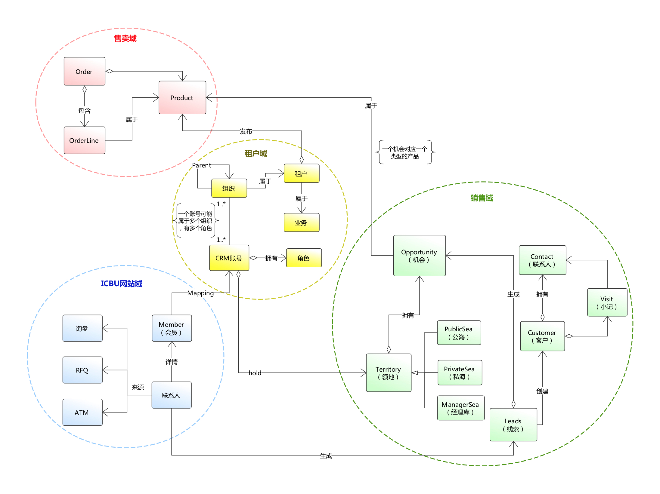 再比如在CRM领域中,公海和私海是非常重要领域概念,是用来做领地划分的,每个销售人员只能销售私海(自己领地)内的客户,不能越界。但是在我们的代码中却没有这两个实体(Entity),也没有相应的语言和其对应,这就导致了领域专家描述的,和我们日常沟通的,以及我们模型和代码呈现的都是相互割裂的,没有关联性。这就给后面系统维护的同学造成了极大的困扰,因为所有关于公海私海的操作,都是散落着各处的repeat itself的逻辑代码,导致看不懂也没办法维护。