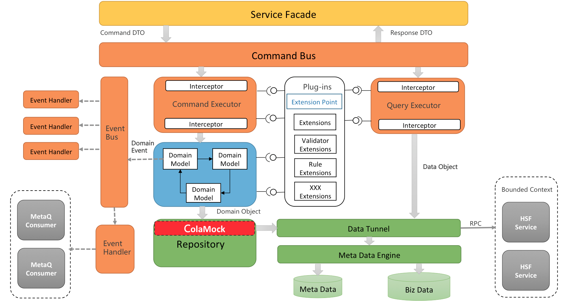 我们的架构原则很简单,即在高内聚,低耦合,可扩展,易理解大的指导思想下,尽可能的贯彻OO的设计思想和原则。我们最终形成的架构是集成了扩展点+元数据+CQRS+DDD的思想,关于元数据前面没怎么提到,这里稍微说一下,对于字段扩展,简单一点的解决方案就是预留扩展字段,复杂一点的就是使用元数据引擎。使用元数据的好处是不仅能支持字段扩展,还提供了丰富的字段描述,等于是为以后的SaaS化配置提供了可能性,所以我们选择了使用元数据引擎。和DDD一样,元数据也是可选的,如果对没有字段扩展的需求,就不要用。最后的整体架构图如下: