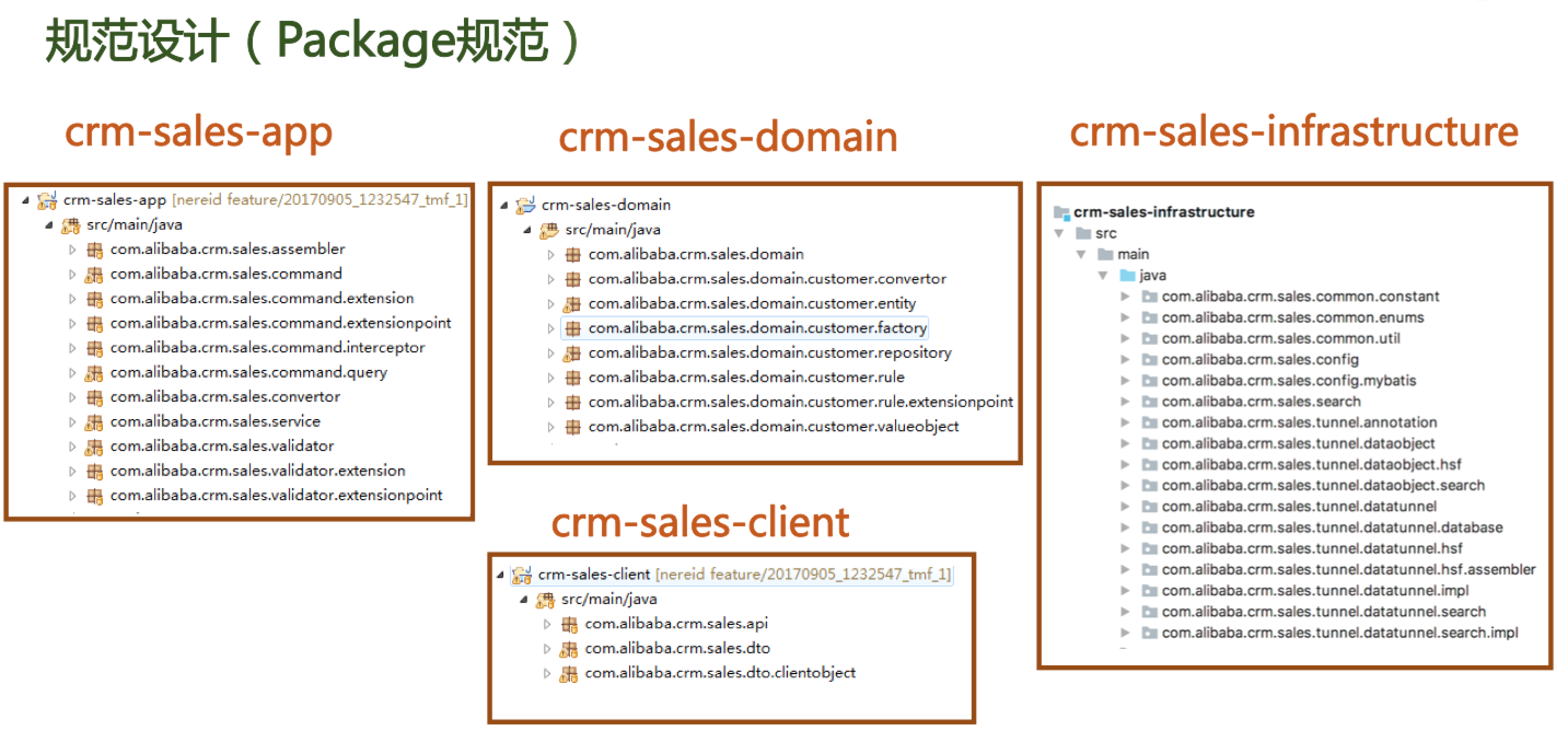 就拿package来说,它不仅仅是一个放一堆类的地方,更是一种表达机制,当你将一些类放到Package中时,相当于告诉下一位看到你设计的开发人员要把这些类放在一起考虑。理想很丰满,现实很骨感,规范的执行是个大问题,最好能在架构层面进行约束,例如在我们架构中,扩展点必须以ExtPt结尾,扩展实现必须以Ext结尾,你不这么写就会给你抛异常。