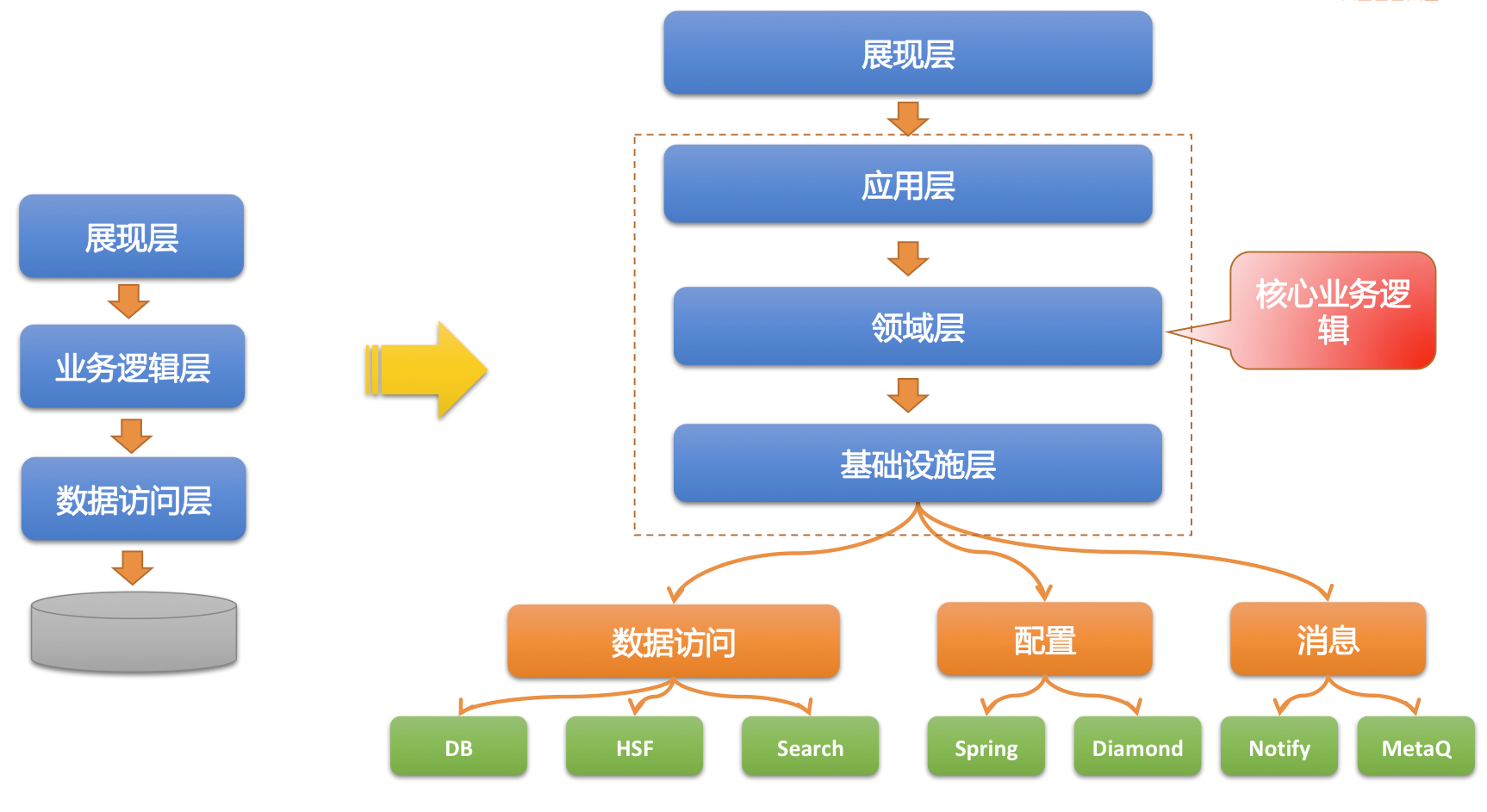 从业这么多年,接触过银行的应用,Apple的应用,eBay的应用和现在阿里的应用,虽然分属于不同的公司,使用了不同的架构,但有一个共同点就是都很复杂。导致复杂性的原因有很多,如果从架构的层面看,主要有两点,一个是架构设计过于复杂,层次太多能把人绕晕。另一个是根本就没架构,ServiceImpl作为上帝类包揽一切,一杆捅到DAO(就简单场景而言,这种Transaction Script也还凑合,至少实现上手都快。