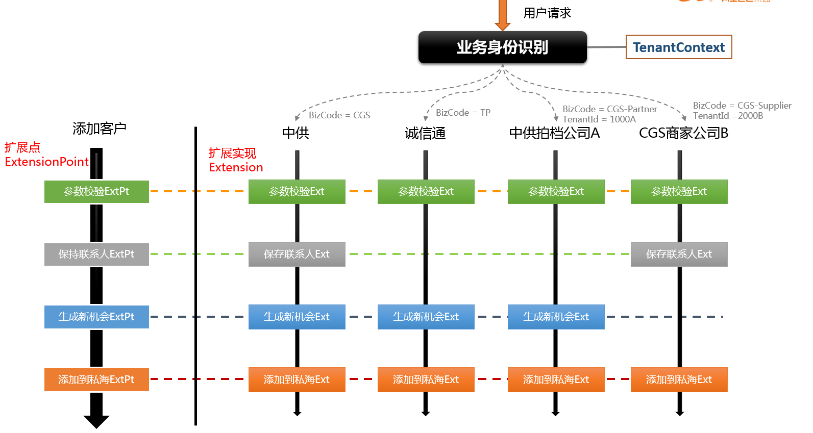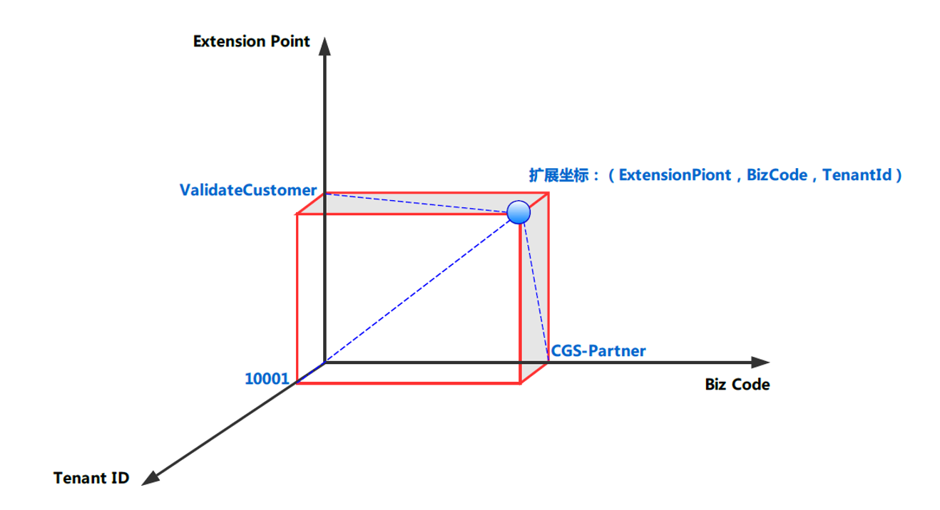 业务身份识别在我们的应用中非常重要,因为我们的CRM系统要服务不同的业务方,而且每个业务方又有多个租户。比如中供销售,中供拍档,中供商家都是不同的业务方,而拍档下的每个公司,中供商家下的每个供应商又是不同的租户。所以传统的基于多租户(TenantId)的业务身份识别还不能满足我们的要求,于是在此基础上我们又引入了业务码(BizCode)来标识业务。所以我们的业务身份实际上是(BizCode,TenantId)二元组。在每一个业务身份下面,又可以有多个扩展点(ExtensionPoint),所以一个扩展点实现(Extension)实际上是一个三维空间中的向量。借鉴Maven Coordinate的概念我给它起了个名字叫扩展坐标(Extension Coordinate),这个坐标可以用(ExtensionPoint,BizCode,TenantId)来唯一标识。