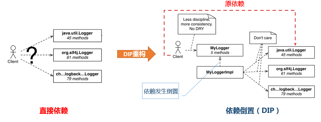 再比如在java应用中使用logger框架有很多选择,什么log4j,logback,common logging等,每个logger的API和用法都稍有不同,有的需要用isLoggable()来进行预判断以便提高性能,有的则不需要。对于要切换不同的logger框架的情形,就更是头疼了,有可能要改动很多地方。产生这些不便的原因是我们直接依赖了logger框架,应用和框架的耦合性很高。