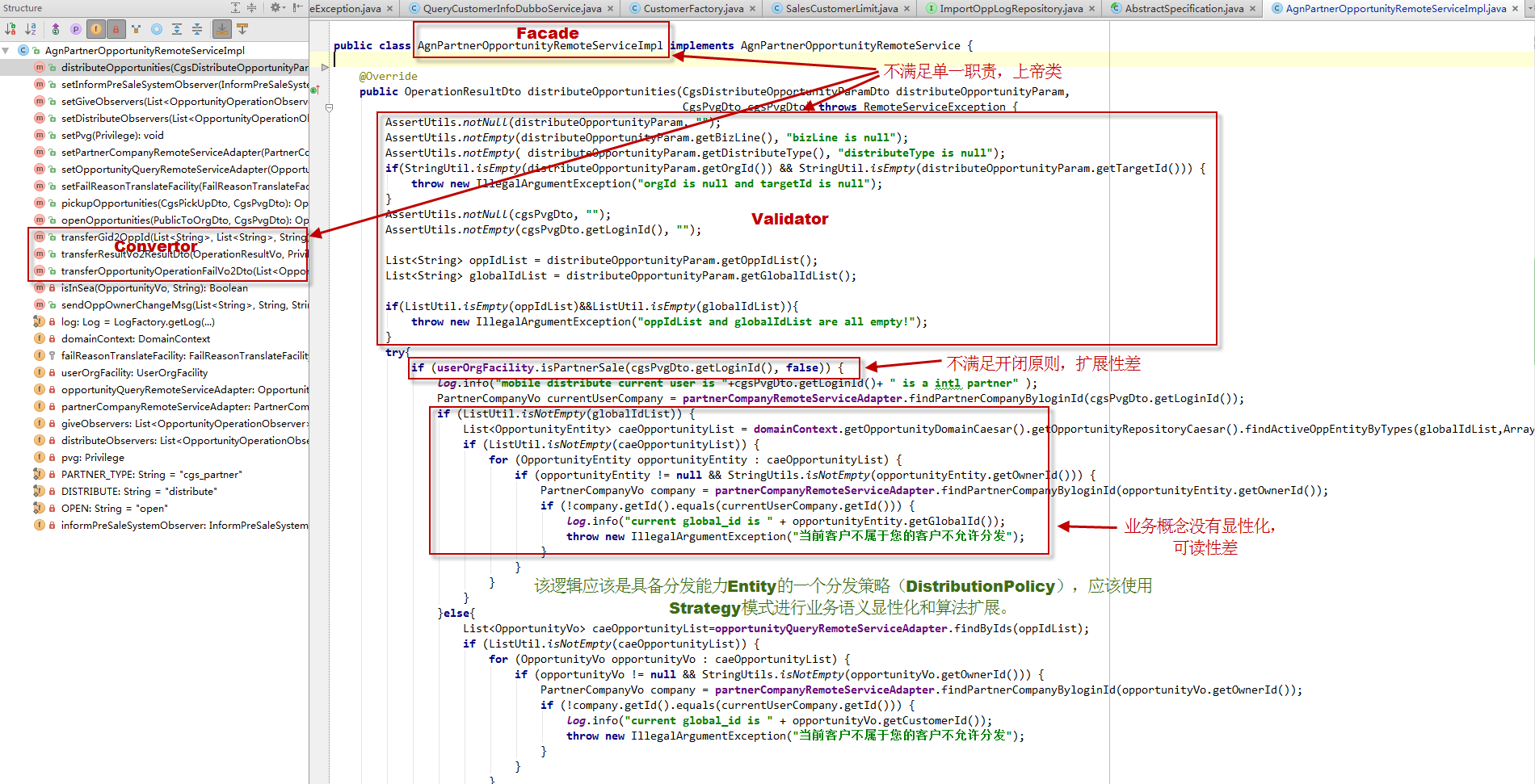 采用领域建模以后,我们在系统中定义了清晰的机会(Opportunity),公海(PublicSea)和私海(PrivateSea)的Entity,相应的行为和业务逻辑也被封装到对应的领域实体身上,让代码充分展现业务语义,让曾经散落在各处找到了业务代码找到了属于它们自己的家,它们应该在的地方。相信我,这种代码可读性的提升,会让后来接手系统的同学对你心怀感恩。下面就是我们重构后Opportunity实体的代码,即使你对CRM领域不了解,是不是也很容易看懂: