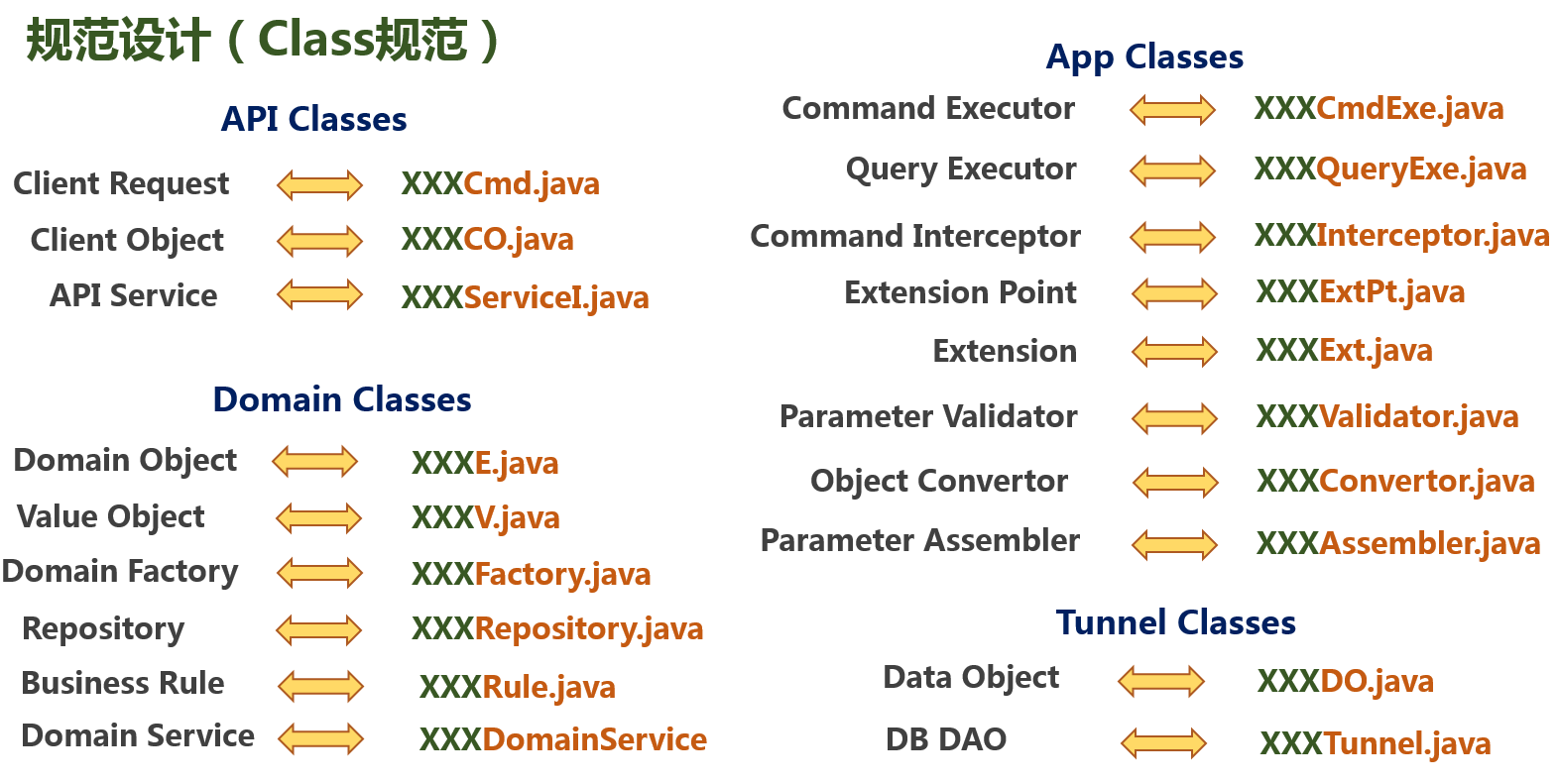 东西放在合适位置后还要贴上合适的标签,也就是要按照规范合理命名,例如我们架构里面和数据有关的Object,主要有Client Object,Domain Object和Data Object,Client Object是放在二方库中和外部交互使用的DTO,其命名必须以CO结尾,相应的Data Object主要是持久层使用的,命名必须以DO结尾。