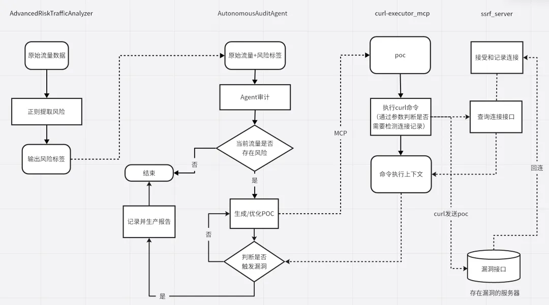 本文探讨基于Langchain生态的Agent、MCP开发,设计一套简单的流量风险审计系统,该系统通过四个模块实现从静态风险识别到动态漏洞验证的完整闭环。