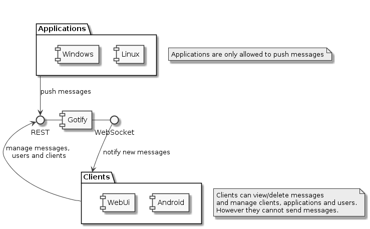 目录 搜索 展开 OpenClaw 安装服务项目和费用一、OpenClaw 开源系列1、OpenClaw(官方版)2、ZeroClawOpenClaw 安装说明Coze OpenClaw【个人 89/月】MaxClaw - 安装部署指南KimiClaw - 安装部署指南云服务器安装【个体户、小微企业】阿里云 OpenClaw 部署步骤本地安装【个人、个体户】OpenClaw 安装服务OpenClaw Token 消耗优化OpenClaw 高级记忆OpenClaw 插件DD接入企业微信无影云电脑一键部署 OpenClawgotify 暂无相关搜索结果! 阅读次数:14 本文档使用 MinDoc 发布 gotify 简介这是 gotify/server 的文档。让我们从一些定义开始:客户端是一种可以管理客户端、消息和应用程序的设备或应用程序。然而,客户端不允许发送消息。应用程序是一种仅能发送消息的设备或应用。用户只能管理(查看/编辑/删除)他们自己创建的客户和应用程序(包括应用程序发送的消息)。一条消息包含以下属性:内容、标题、创建日期、应用 ID 和优先级。作者:Ddd4j 创建时间:2026-03-23 15:50最后编辑:Ddd4j 更新时间:2026-03-23 15:50
