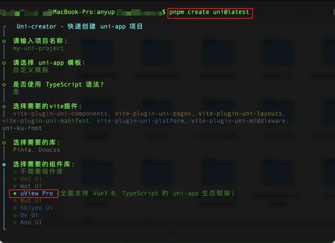 在交互式选择时,选择需要的插件和库、选择需要的组件库 uView Pro