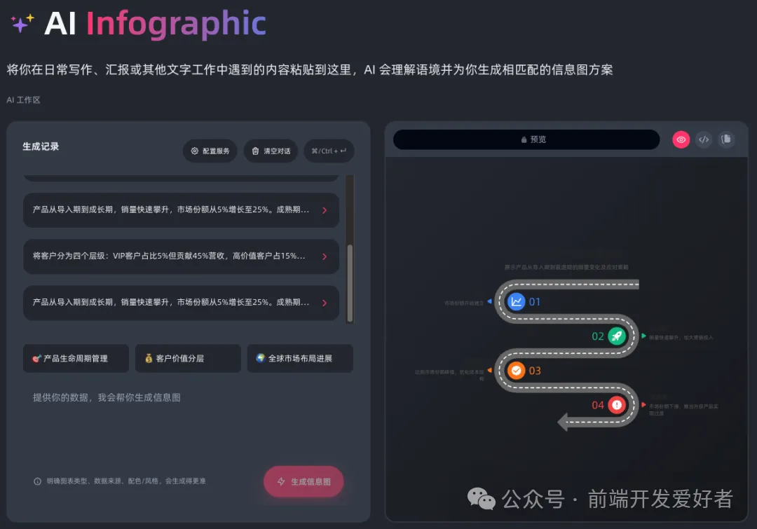 - 语法生成器:根据描述生成信息图语法