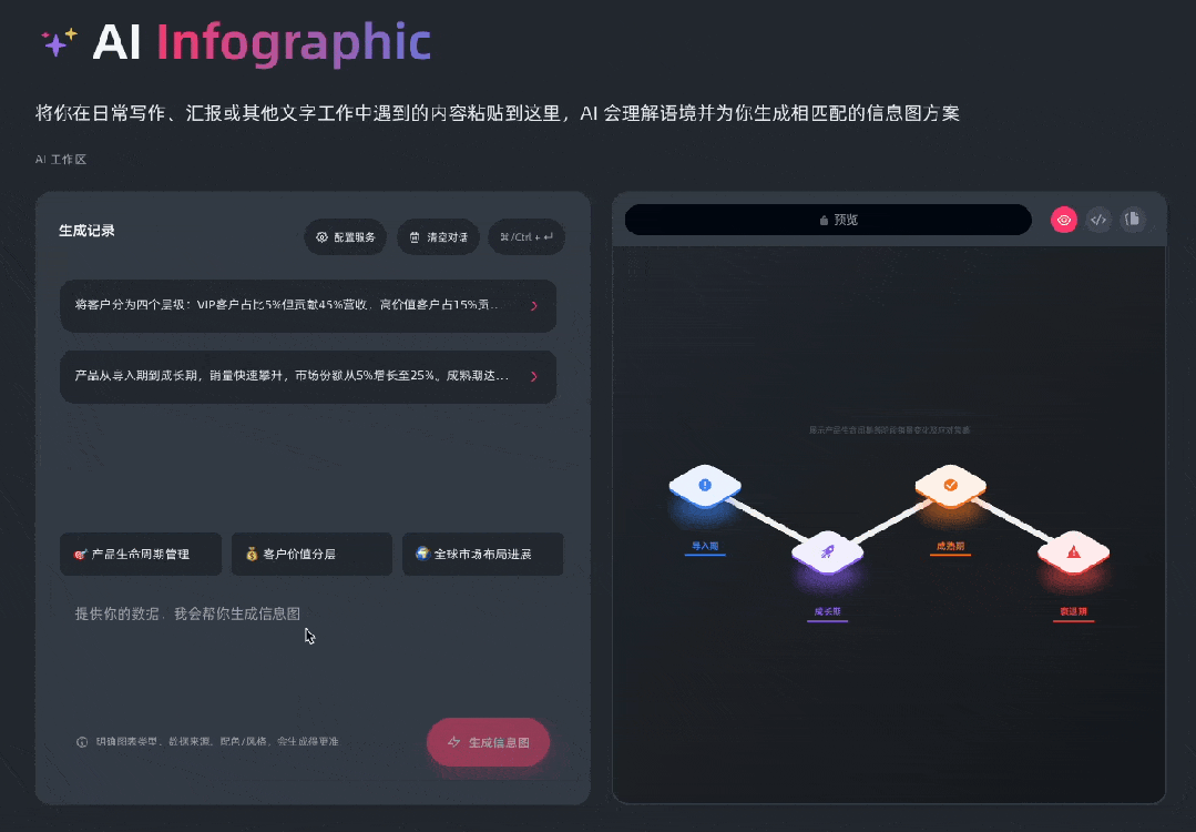你只要把文字内容粘贴进去,AI 会自动理解语境,帮你生成匹配的信息图。